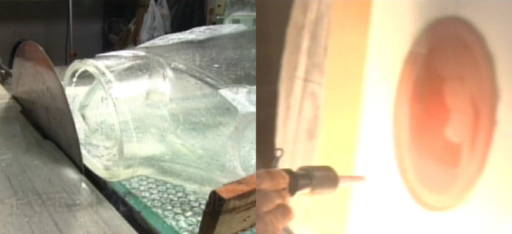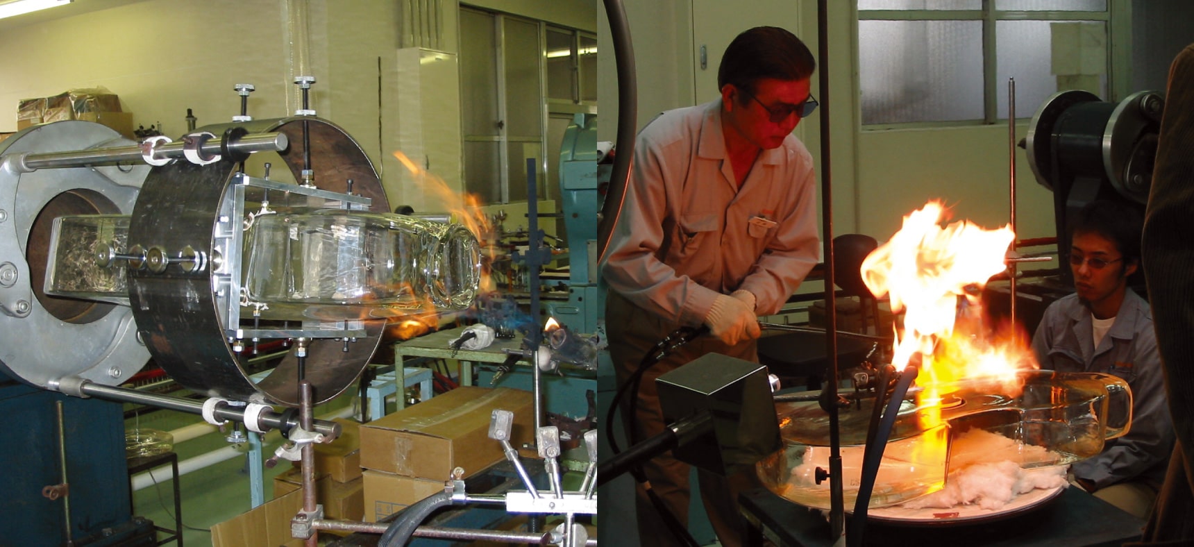 手吹きでかつ停止吹きの技術を持つ熟練の職人が試行錯誤した後、ボディーの再現に成功。