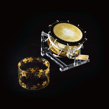 2010年にはガラスの和太鼓、小鼓、大鼓、笛が完成し、日本の伝統楽器を使ったお囃子を演奏することができました。中でも、大鼓・小鼓はガラス製の胴部分と左右に貼る革の相性で音質が大きく異なるため、いくつかの胴部分を製作し、最も良質な音を出せる胴を選びぬきました。こだわりの音質とガラスの和楽器の美しさをご堪能下さい。