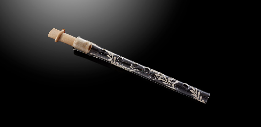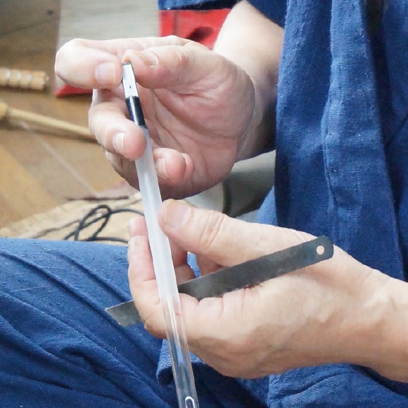 耐熱ガラス製のため木製よりも軽く、かつ温度に左右されず安定した音程を保てるという特性があります。また製作にあたっては、奏者の監修のもと、円筒形の成形をはじめ、指穴の大きさや吹き口の角度を職人による手作業で一つひとつ丹念に加工・調整して、ガラスならではの音に加え、木製の尺八の音の深みを再現する事にこだわりました。- 重量: