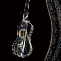 2011.3.11からの復興のシンボルとして製作した「ガラスのギター」。総制作費約1,000万円、10名の熟練した職人が作り上げた、世界初のガラスで出来た演奏用クラシックギターとなります。ガラスのギター(最大幅部)、厚さは2.5 ~ 3.0mm、全重量約3.7kgとなっており、近年のクラシックギターより、少し小さめのサイズで、19世紀のヨーロッパの原型をもとにしています。装飾には、手書きのペイントを施し、繊細でありながら、ガラスの美しさを引き出したデザインとなっています。世界初演奏用クラシックギター 2011年9月からガラスの成形に入り、アクリルのネック部分や音の調整をしながら、今年の10月に完成するまで、約1年間を要し、ついに完成にいたしました。本ギターの音色の監修には、人気ギタリストの村治佳織さんにも監修頂き、木のギターとは一味違う、新しい音色が楽しめるギターに仕上がりました。