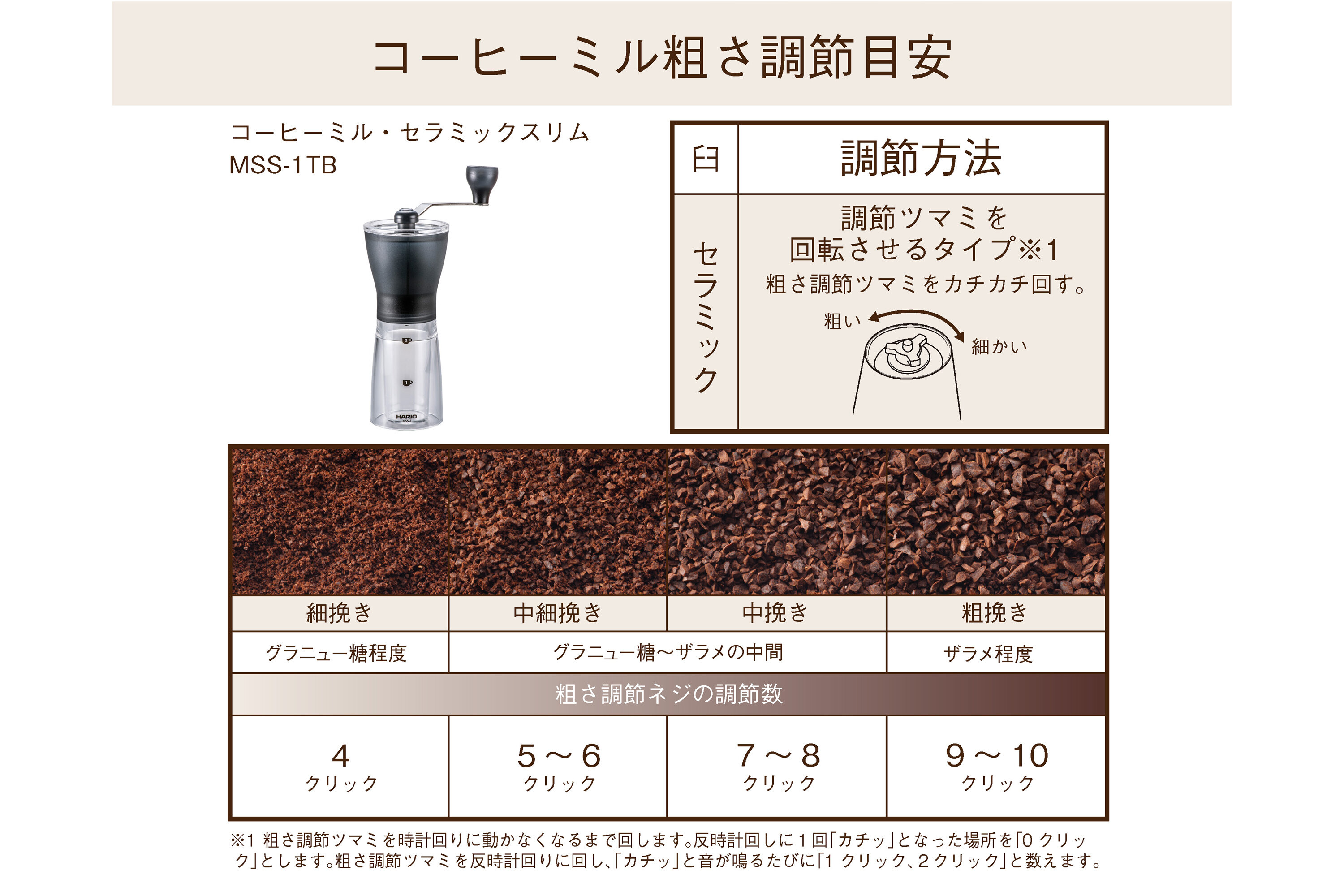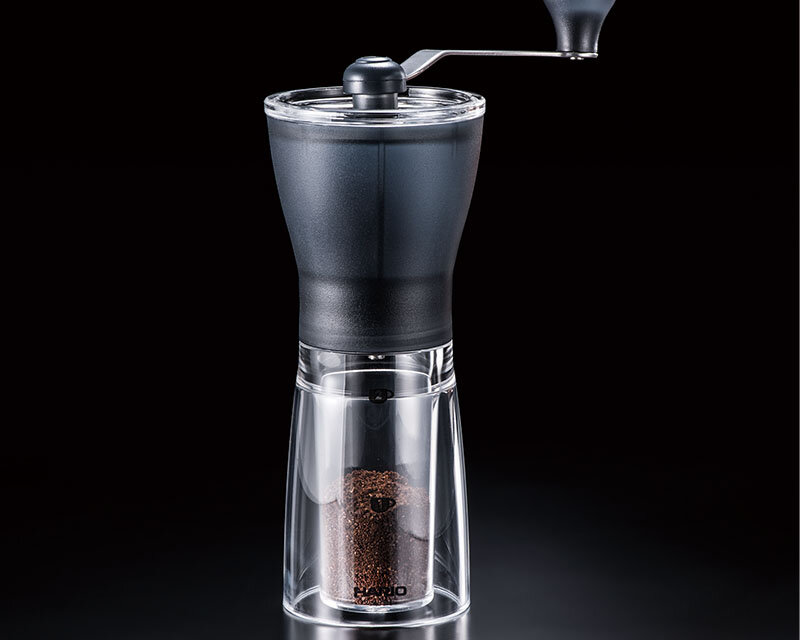 セラミック製の臼を使用しているため、摩擦熱が発生しにくく、熱によるコーヒー粉へのダメージを防ぎます。ハンドルをはずすとコンパクトに納まるので、持ち運びに便利です。