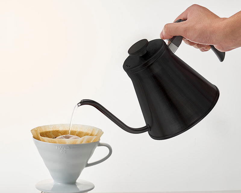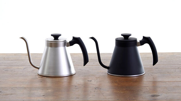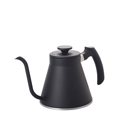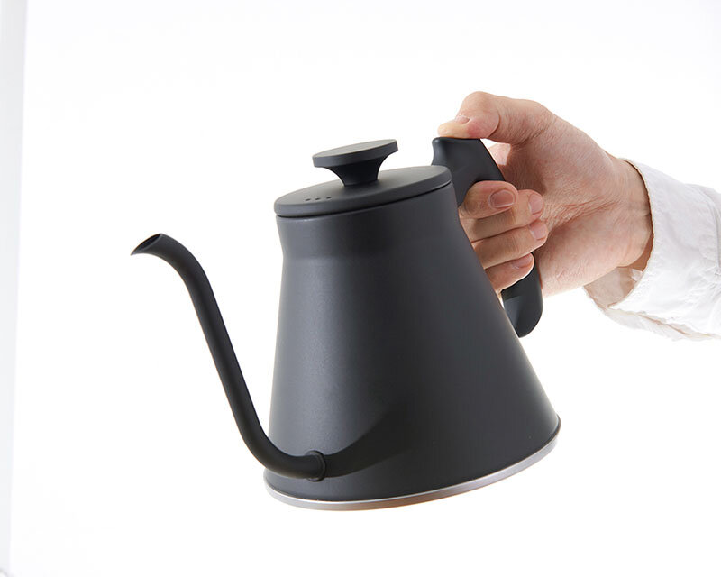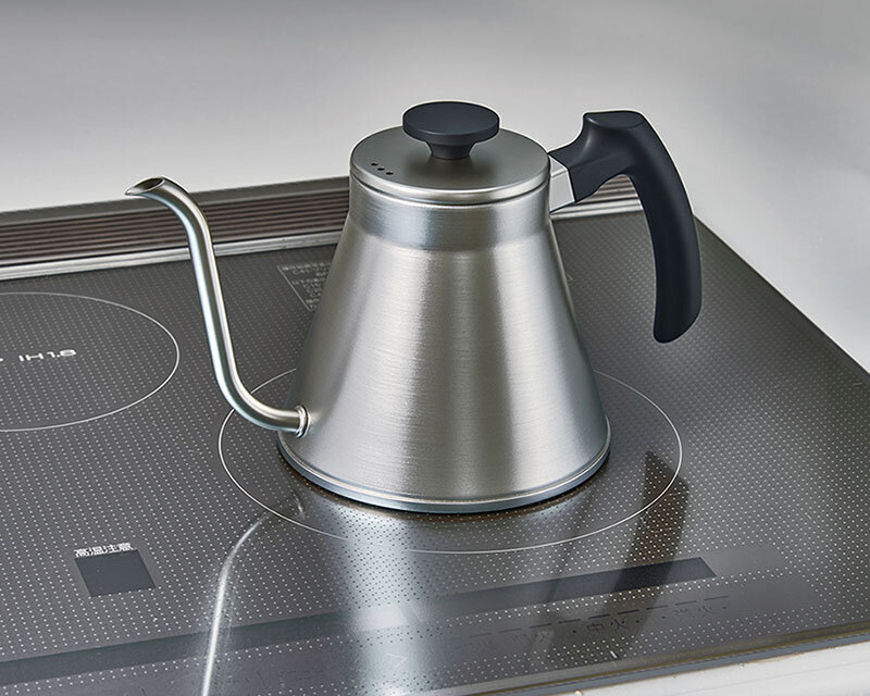 注ぎ口の形状をより注ぎやすくコントロールしやすい形状にしました。また、ハンドルの持ち方にこだわり、コーヒードリップシーンに「フィット」する新しいケトルです。フタは逆さに置けるフラットツマミです。全ての熱源(IH200V・100V、ガスコンロ、エンクロヒータ、ラジエントヒータ、ハロゲンヒータ、シーズヒータ)に対応しています。