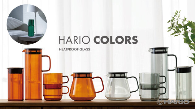 耐熱ガラス製のカラーガラスシリーズ「HARIO COLORS」。テーブルトップに彩りを添えます。