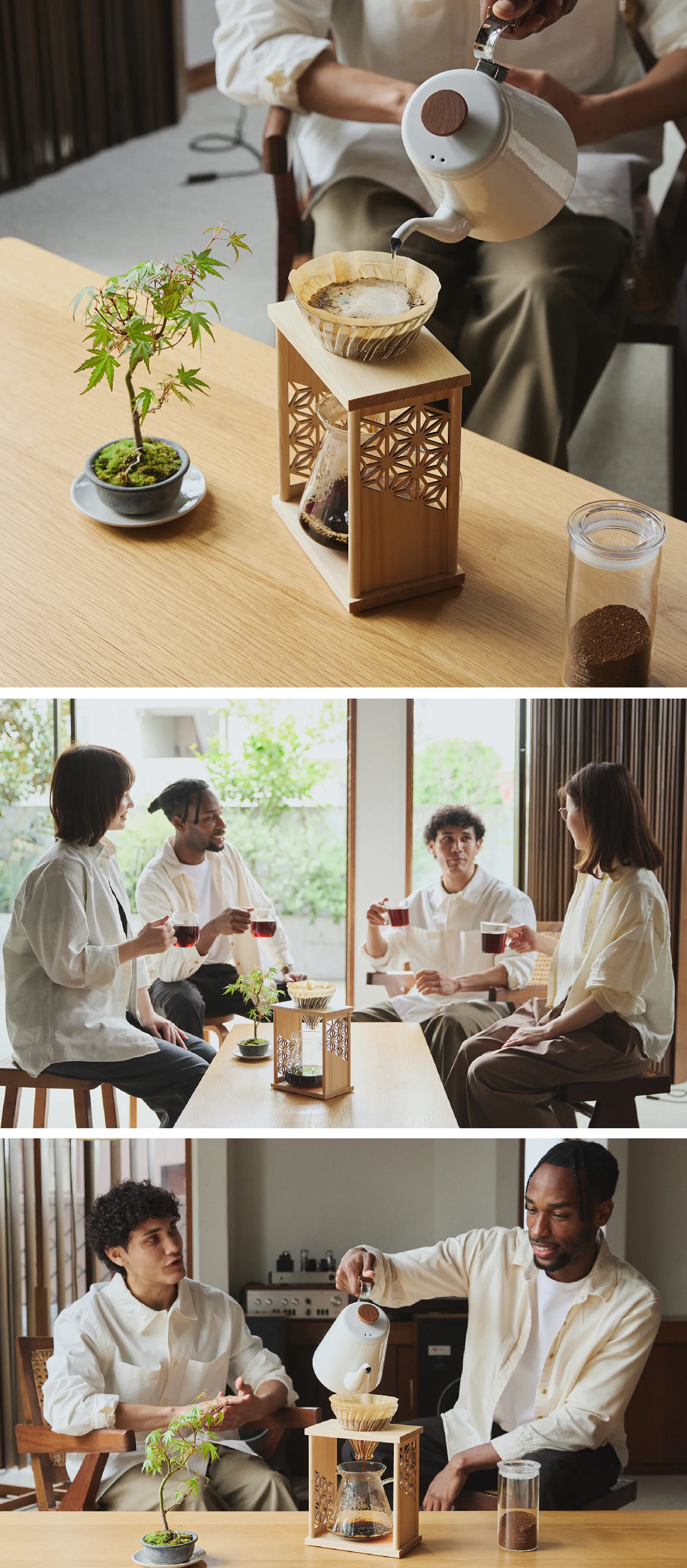 日本の伝統模様「麻の葉」をあしらったコーヒードリップスタンド。無病息災などの願いが込められた縁起の良いデザインで、日々のコーヒータイムに和の趣と温もりを添えます。