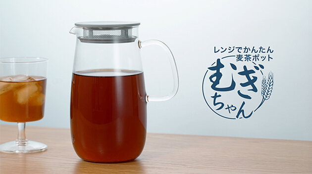 麦茶本来の深い味わいを楽しむには、直火で水を沸騰させ、抽出後に粗熱をとり急冷する手間がかかります。レンジでかんたん麦茶ポット むぎちゃんは、レンジで少量の水を加熱し、ティーバッグを加えるだけで濃い麦茶を短時間で抽出できます。あとは水で希釈し、麦茶本来の深い味わいをお愉しみいただけます。火を使わないので安心です。フタには茶こしが付いており、さまざまな茶葉のお湯出しや水出しも可能です。容量は高さを抑えつつ1リットル。冷蔵庫のドアポケットにも収まり、日々の暮らしにぴったりのポットです。