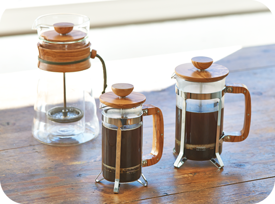 プレス式のコーヒーメーカーはポットに直接コーヒー粉を入れ、お湯を注いでフィルターを押すだけで深い風味のコーヒーが愉しめます。