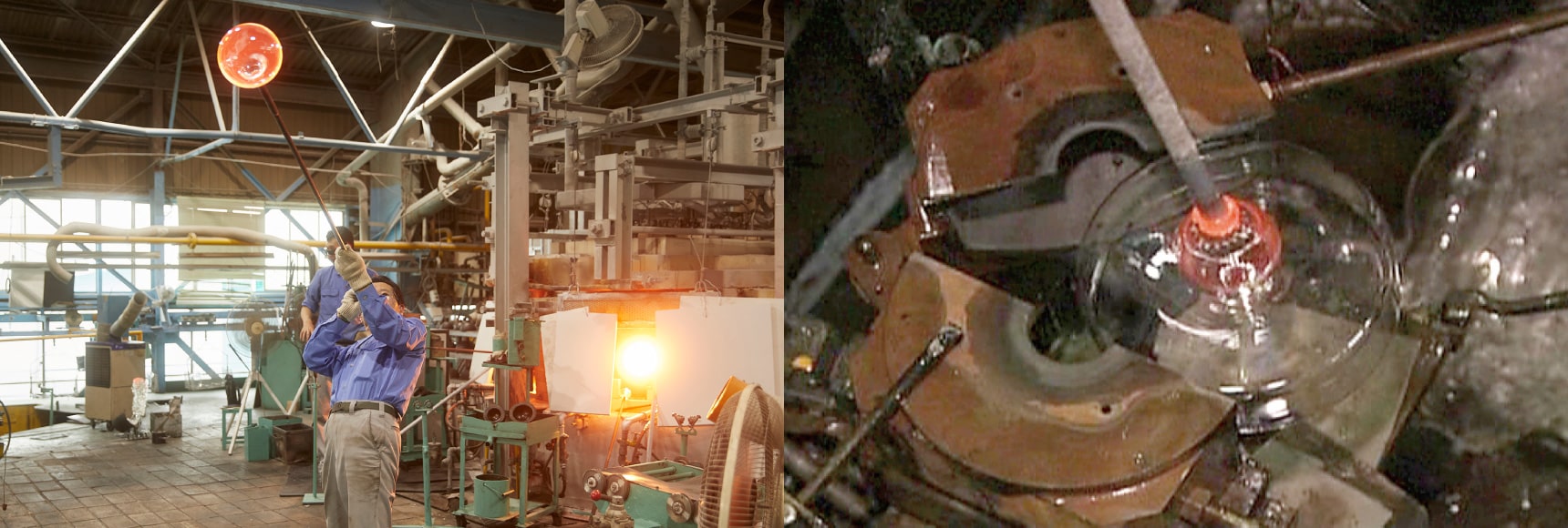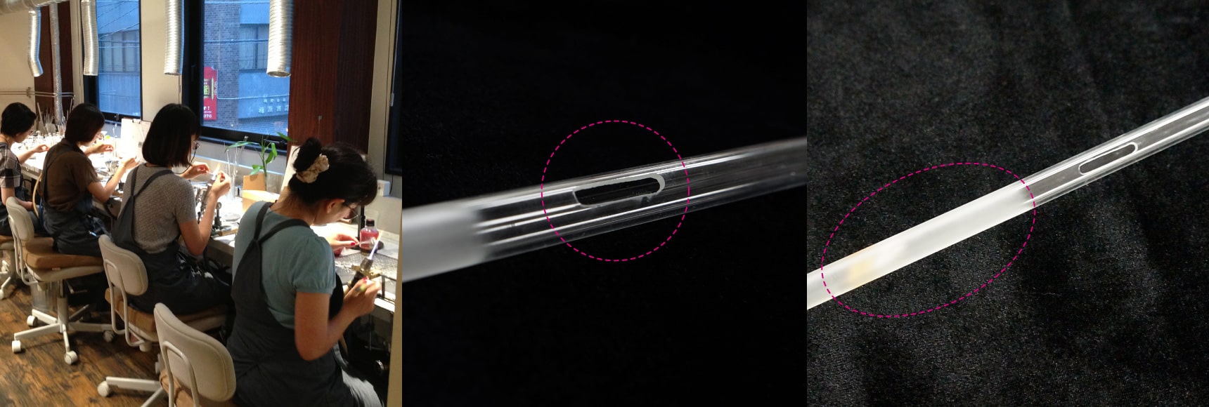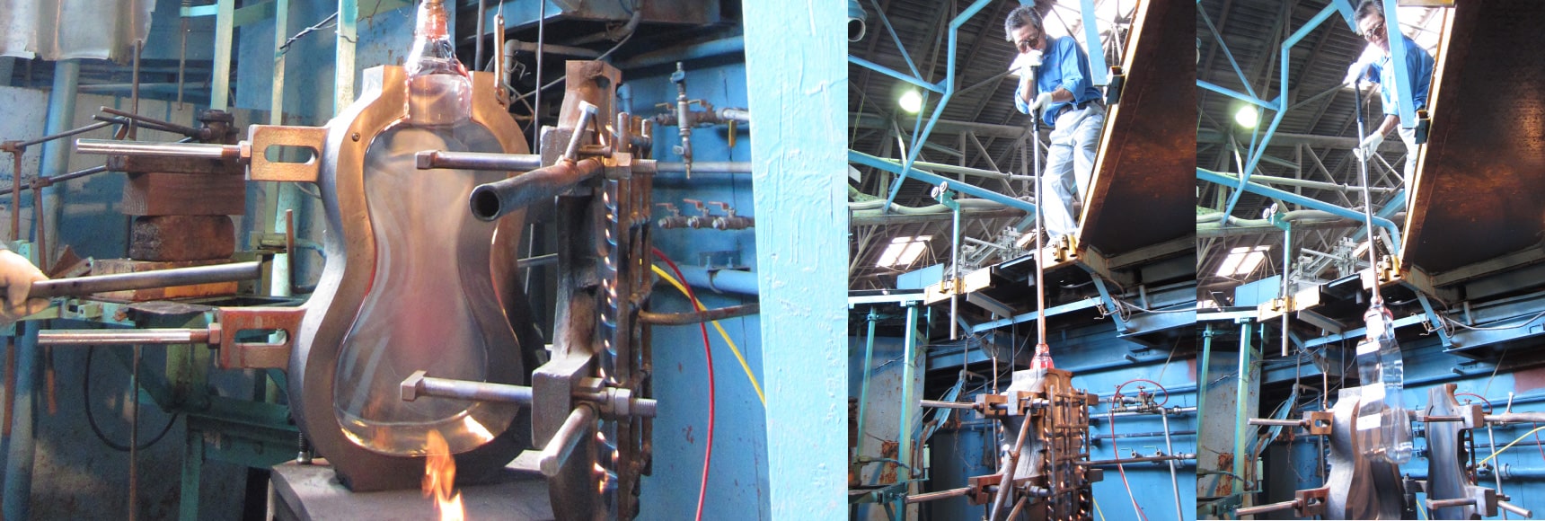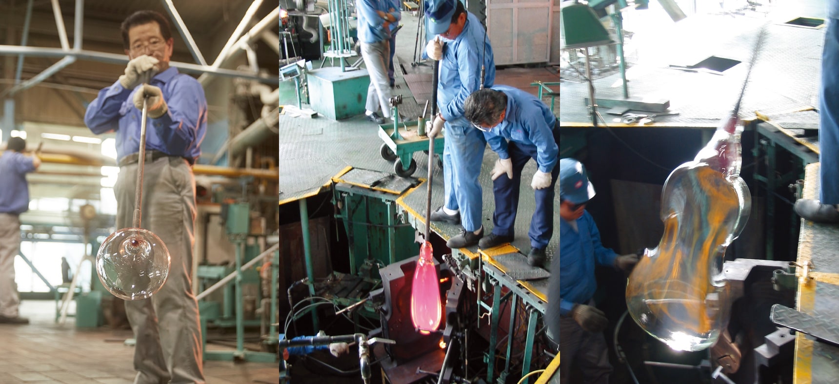 手吹きでかつ停止吹きの技術を持つ熟練の職人が試行錯誤した後、ボディーの再現に成功。