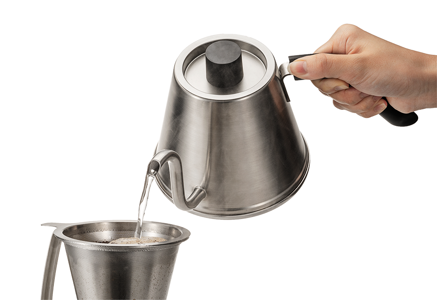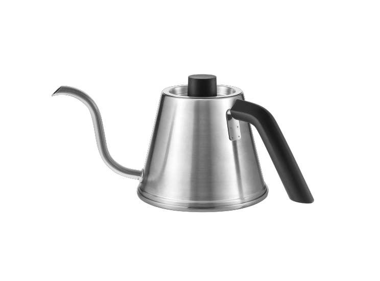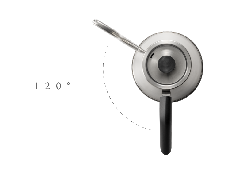 コーヒー抽出の世界大会「World Brewers Cup」アジア人初世界チャンピオンである粕谷 哲氏監修。ネルドリップスタイルで重要な繊細な注湯をより扱いやすくするために既成概念に囚われずデザインしたケトルです。従来のケトルのように手首を曲げて注ぐスタイルではなく腕自体を回して注ぎをコントロールするスタイルなので、より細かいコントロールがしやすくなっています。