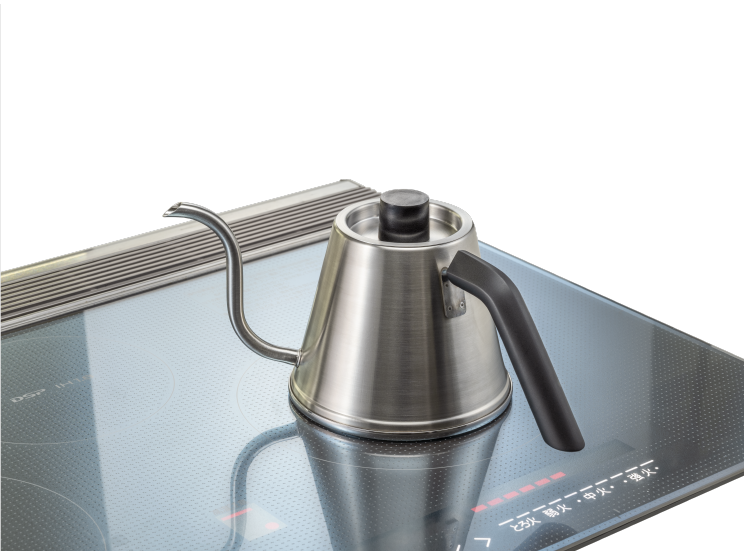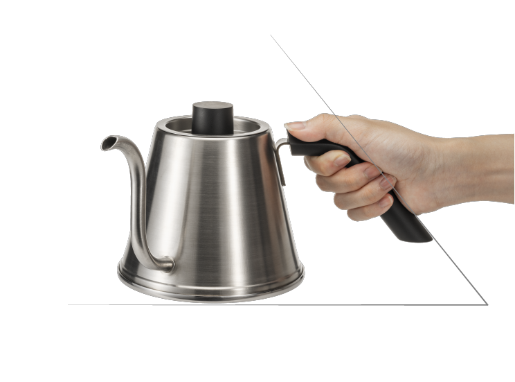 持った際にケトルが⾃然と⽔平になり、注ぎのコントロールに無駄な⼒を必要としません。斜めに⼊ったフラットな指置きで親指での微細なコントロールを可能にしました。