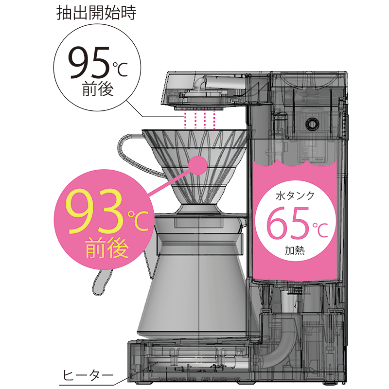 コーヒーの抽出に最適な高温93℃前後でドリップ。