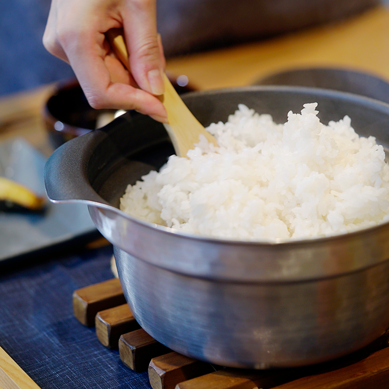 ステンレスとアルミの4層構造の鍋身は熱をまんべんなく伝え、ご飯をふっくら炊き上げます。