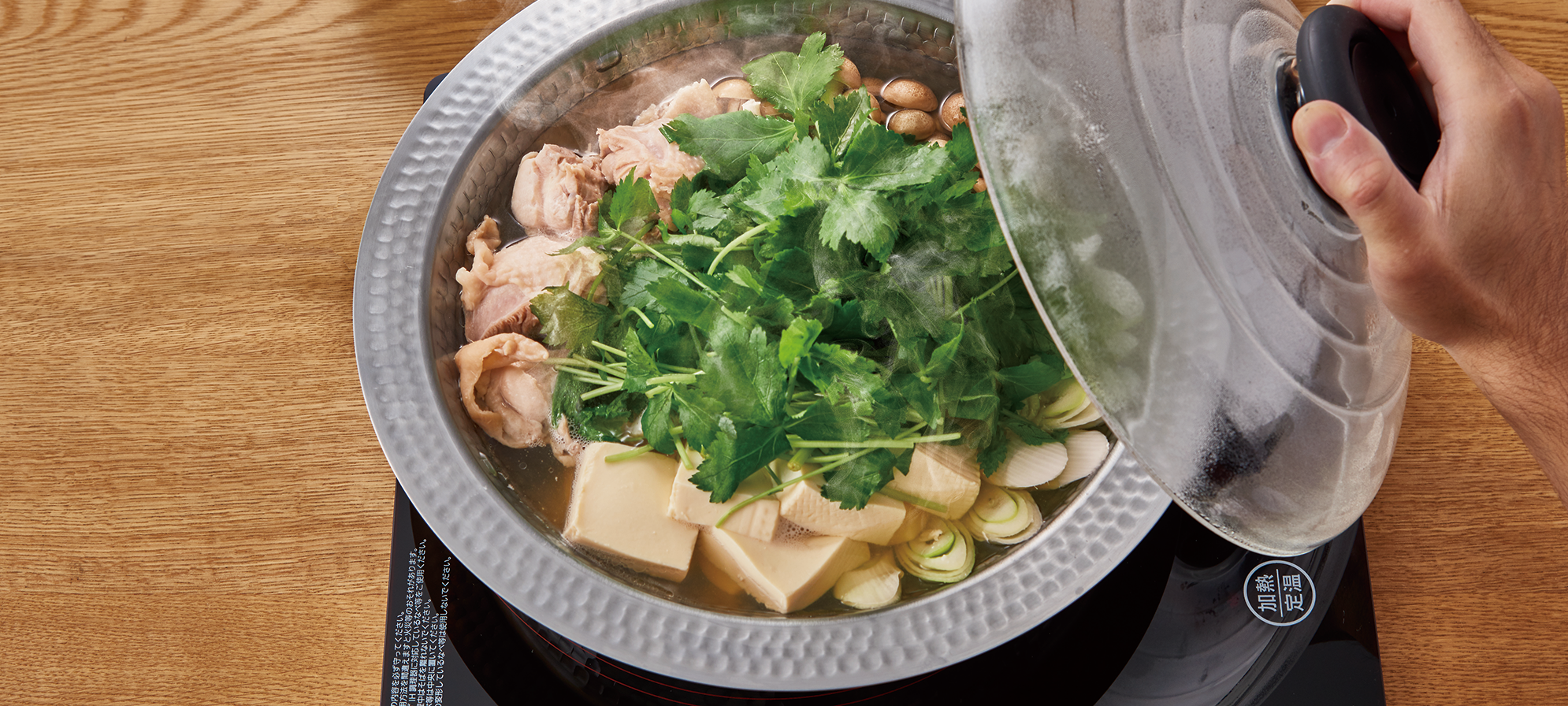 たっぷり具材が入るドーム型のフタは、透明な耐熱ガラス製で調理中、中の様子が見えて安心。