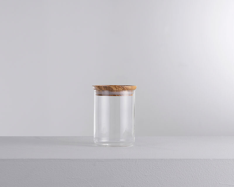 オリーブウッドのフタと耐熱ガラス製のキャニスター。ナチュラルな素材にこだわりました。コーヒー、お茶、ドライフルーツなどの保存にお使いいただけます。見せる収納にもおすすめです。