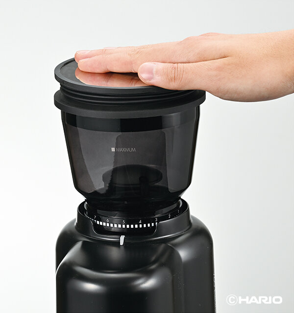 内部静電気除去機能を搭載し、コーヒー粉の飛び散りを軽減します。また、フタにはクリーナー機能が付いているのでお手入れも楽です。