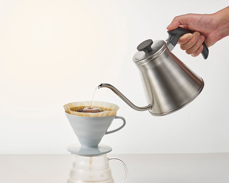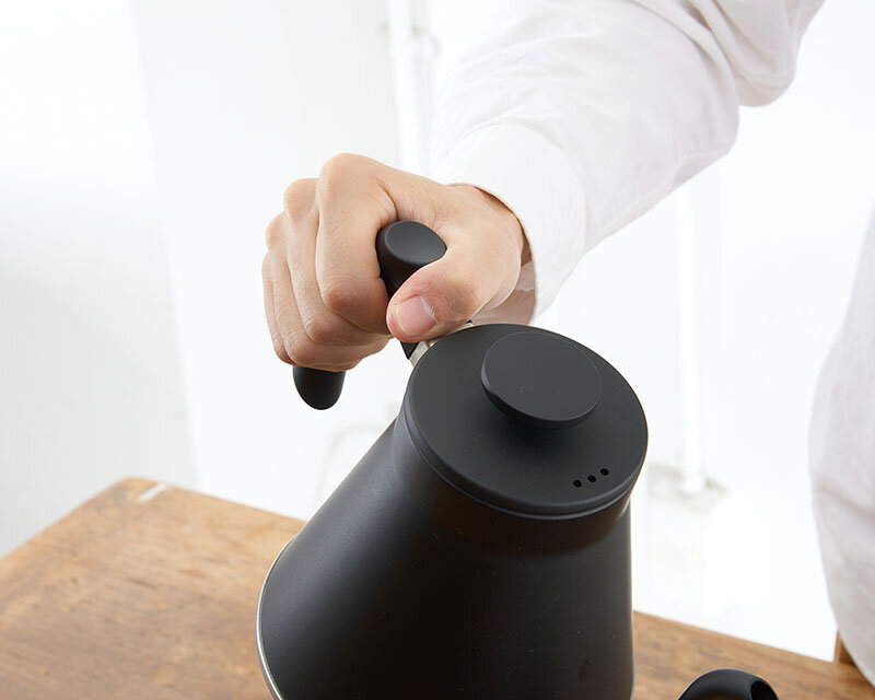 注ぎ口の形状をより注ぎやすくコントロールしやすい形状にしました。また、ハンドルの持ち方にこだわり、コーヒードリップシーンに「フィット」する新しいケトルです。フタは逆さに置けるフラットツマミです。全ての熱源(IH200V・100V、ガスコンロ、エンクロヒータ、ラジエントヒータ、ハロゲンヒータ、シーズヒータ)に対応しています。