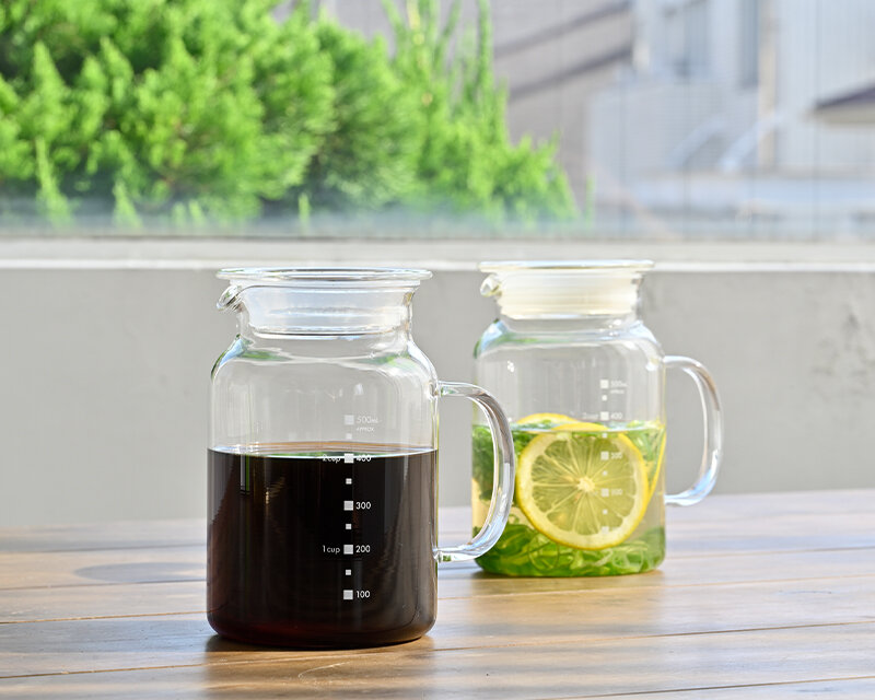 本体、フタ共に耐熱ガラス製なので、熱湯洗浄・食器洗い乾燥機OKでいつも清潔に保つことができます。フタをしたまま電子レンジOK。作ってそのまま保存、フタをしたまま注ぐこともできます。作りやすい目安メモリ付。