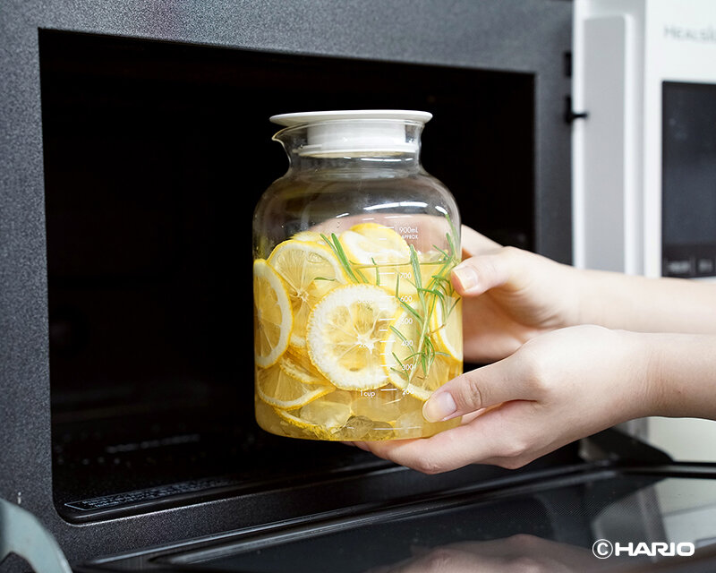 耐熱ガラス製でメモリ付き、フタをしたまま温め・注ぐことができます。