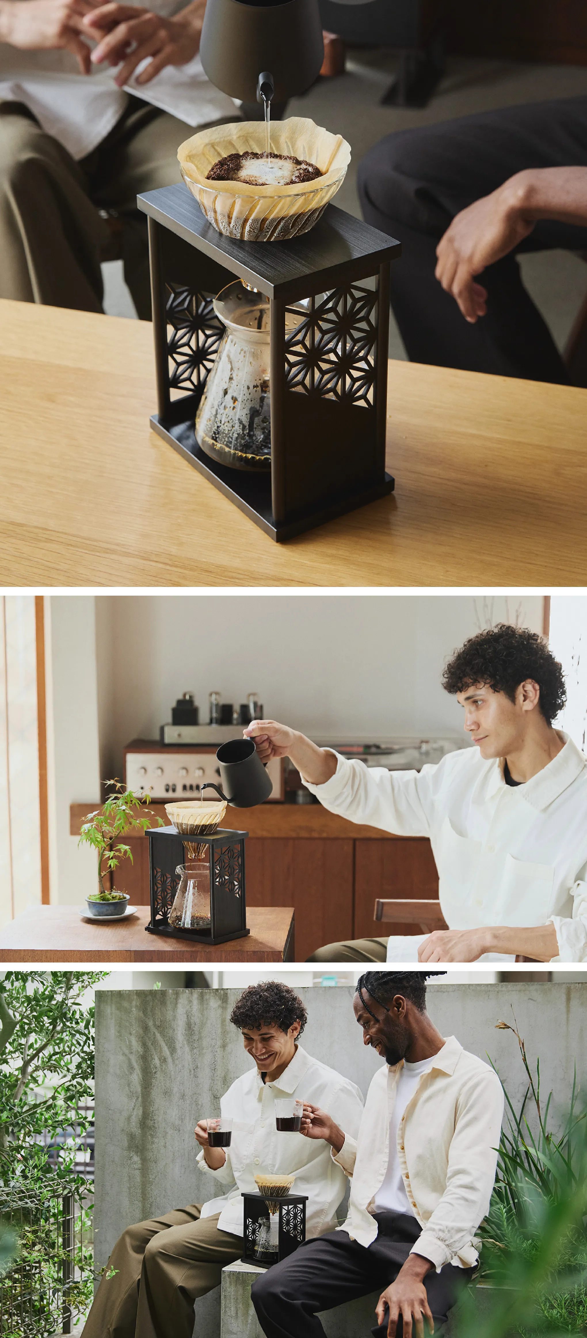 日本の伝統模様「麻の葉」をあしらったコーヒードリップスタンド。無病息災などの願いが込められた縁起の良いデザインで、日々のコーヒータイムに和の趣と温もりを添えます。