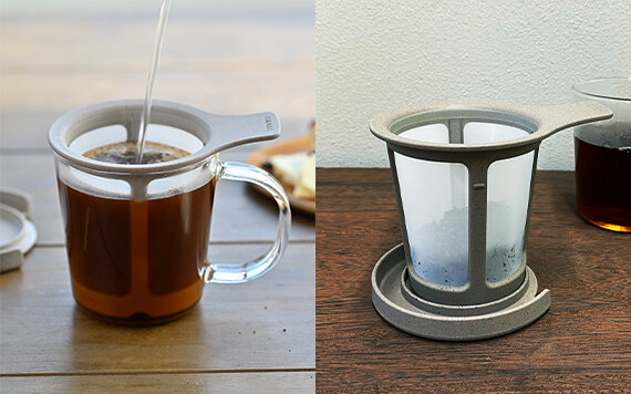 ペーパーを使わなくても美味しいコーヒーが淹れられる、微粉の出にくい細かいメッシュのドリッパーと耐熱ガラスマグのセットです。フタは使用後のストレーナー置きになります。
