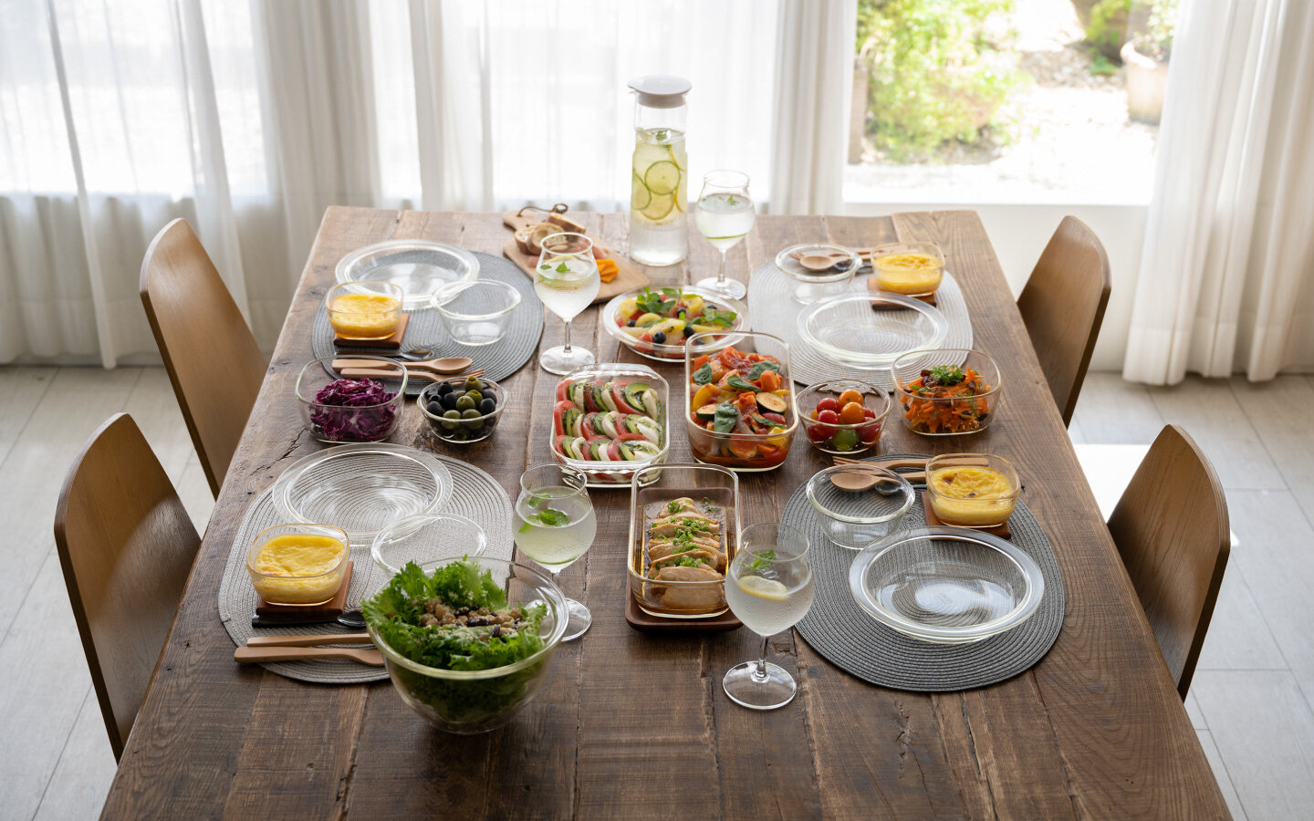 手作りドリンク&おつまみを。見栄えのするメニューとしてぜひ加えていただきたいのが、ビネガーズシリーズを使った飲み物やお料理。フルーツポットで果実酒を漬ければ見た目も鮮やかなパーティードリンクに。健康的でおつまみとして人気のピクルスは、長いものを野菜スティック状にしてそのまま漬けられる縦長タイプで作ってみてください。フードコンテナで作るマリネも好評です。