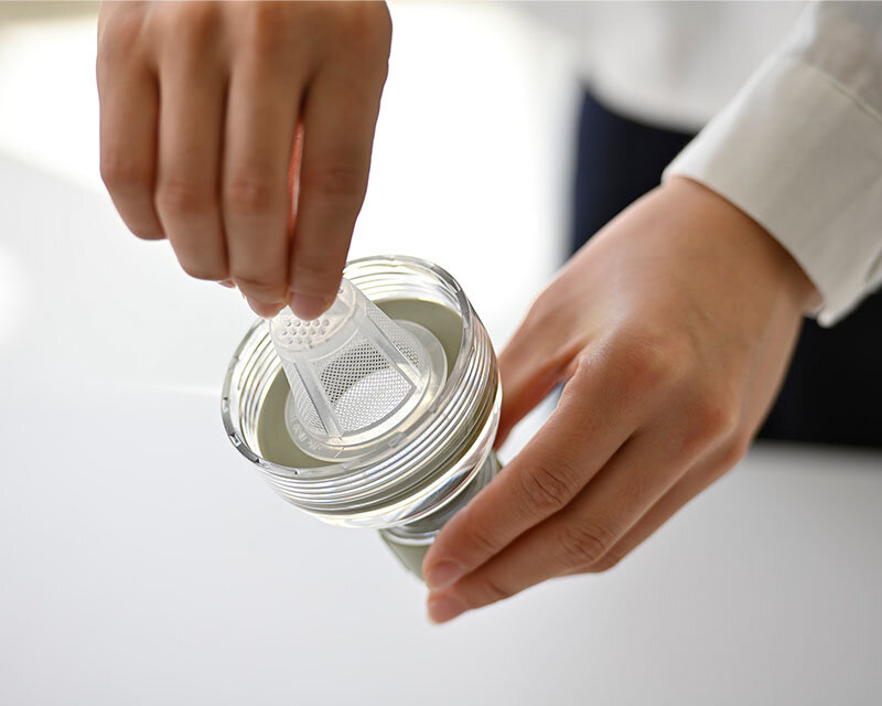飲み口と本体はPCT樹脂で、BPA FREE・透明性・耐熱性・衝撃強度のある安心素材です。フィルターが付いているのでお好みの水出し茶やフルーツティーを持ち歩くことができます。お好みの飲み物や水出し茶・フレーバーウォーターを持ち歩けます。フィルター付きなので抹茶シェイカーとしてお使いいただけます。飲み口の内側にフィルターメッシュがセットされています。