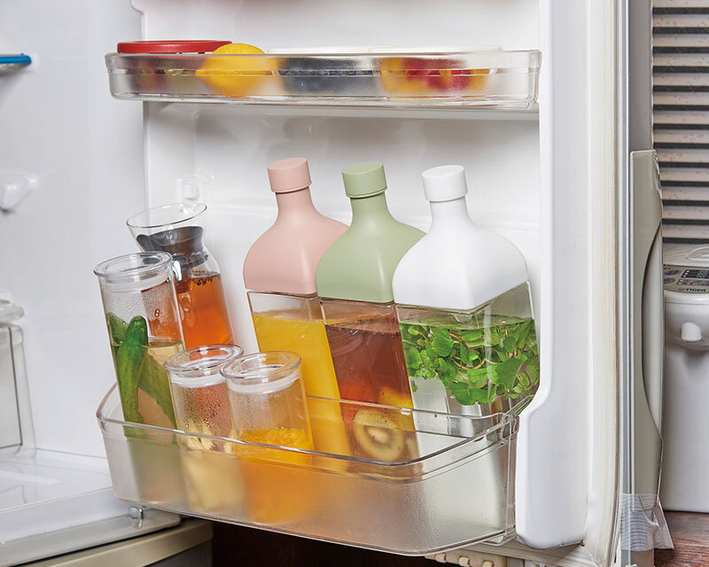 本体ボトル部分がPCT樹脂の角型ボトルです。注ぎ口内側にフィルターが付いているので水出し茶を作ることもできます。注口部分にフィルターがセットされているのでそのまま注げます。1,200mlの大容量なので、水出し茶はもちろんフレーバーウォーターをたっぷり作って保存して置けます。冷蔵庫の棚に横置き保存ができます。冷蔵庫のドアポケットにも収納OK。