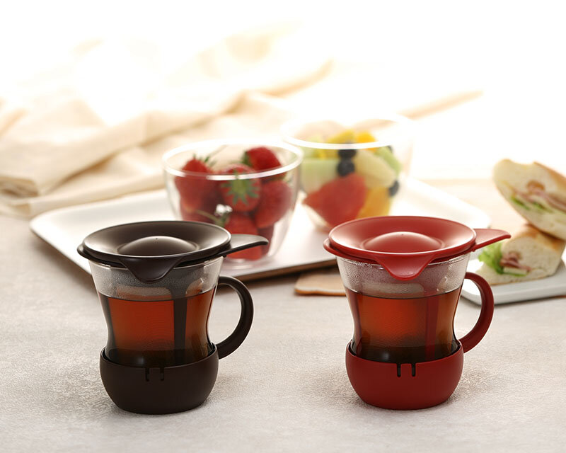 一人分のお茶が手軽に淹れられます。日本茶はもちろん紅茶、ハーブティーもOK。フタは逆さにすると、抽出後の茶こしを置くトレーになります。長い茶こし付きなので、一人分も美味しくお茶が抽出できます。フタ・茶こしを外せば電子レンジOK。ホルダーに包まれている安心構造。